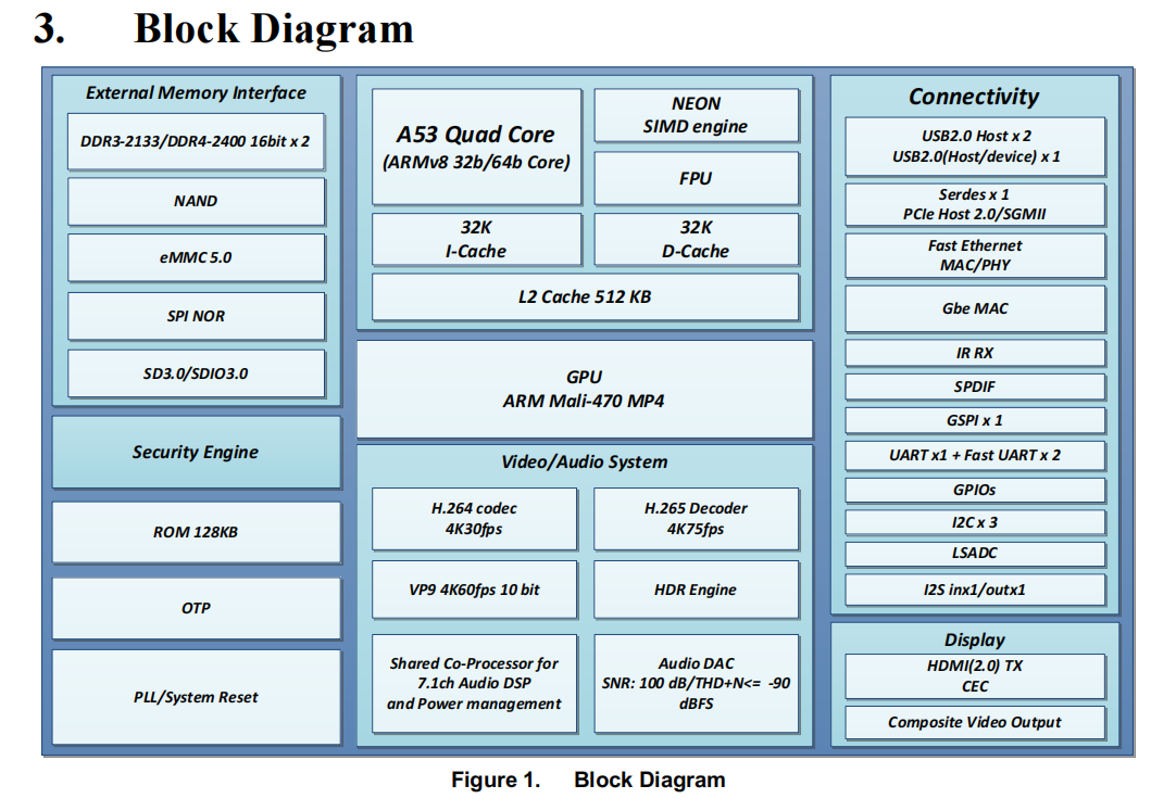 Boot-ROM和OTP(一次性可編程ROM)用于安全啟動(dòng)和密鑰存儲(chǔ),集成10/100以太網(wǎng)MAC和PHY和千兆以太網(wǎng)MAC,集成三重USB2.0高速支持OTG控制器和PHY,用于USB Type-C插座支持SDIO 3.0接口