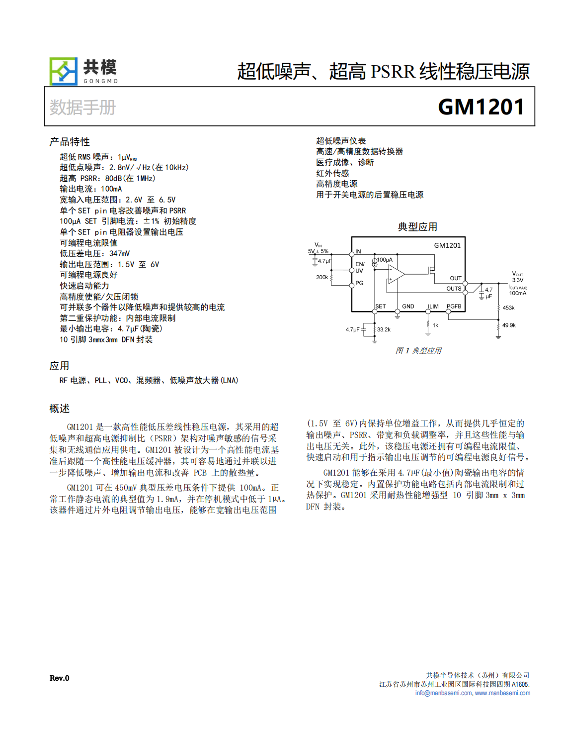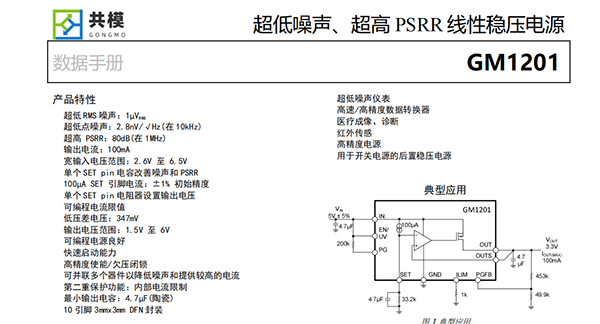GM1201是一款高性能低壓差線性穩(wěn)壓電源,其采用的超低噪聲和超高電源抑制比(PSRR)架構(gòu)對噪聲敏感的信號采集和無線通信應(yīng)用供電。GM1201被設(shè)計為一個高性能電流基準(zhǔn)后跟隨一個高性能電壓緩沖器,其可容易地通過并聯(lián)以進(jìn)一步降低噪聲、增加輸出電流和改善PCB上的散熱量。