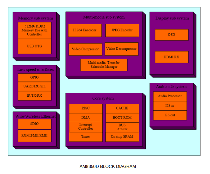 AM8350D還集成了1個(gè)USB OTG控制器、UART、I2C、SPI等。內(nèi)置512Mb DDR2內(nèi)存芯片