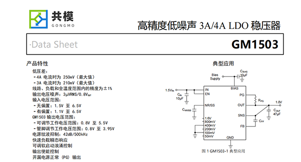 GM1503集低噪聲、高PSRR和高輸出電流能力等特性于一體,非常適合為高速通信、視頻、醫(yī)療或測(cè)試和測(cè)量應(yīng)用等噪聲敏感型組件供電。GM1503高性能的輸出品質(zhì),可抑制電源產(chǎn)生的相位噪聲和時(shí)鐘抖動(dòng),因此它非常適合為高性能串行器和解串器(SerDes)、模數(shù)轉(zhuǎn)換器(ADC)、數(shù)模轉(zhuǎn)換器(DAC)和射頻組件供電。該器件具備快速負(fù)載瞬態(tài)響應(yīng)的性能和大于5V的輸出能力,尤其適合射頻放大器使用。對(duì)于需要以低輸入和低輸出電壓運(yùn)行的數(shù)字負(fù)載(例如專(zhuān)用集成電路(ASIC)、現(xiàn)場(chǎng)可編程門(mén)陣列(FPGA)和數(shù)字信號(hào)處理器(DSP)),GM1503所具備的高精度(在線路、負(fù)載和溫度范圍內(nèi)可達(dá)1%)、快速瞬態(tài)響應(yīng)性能和軟啟動(dòng)能力可確保實(shí)現(xiàn)出色的系統(tǒng)性能。外部使能控制和電源良好指示功能夠更容易的進(jìn)行時(shí)序控制。GM1503采用20腳3.5mm×3.5mm QFN和5mm×5mm QFN封裝,結(jié)溫范圍為T(mén)J=-40°C to+125°C和TJ=-55°C to+125°C。