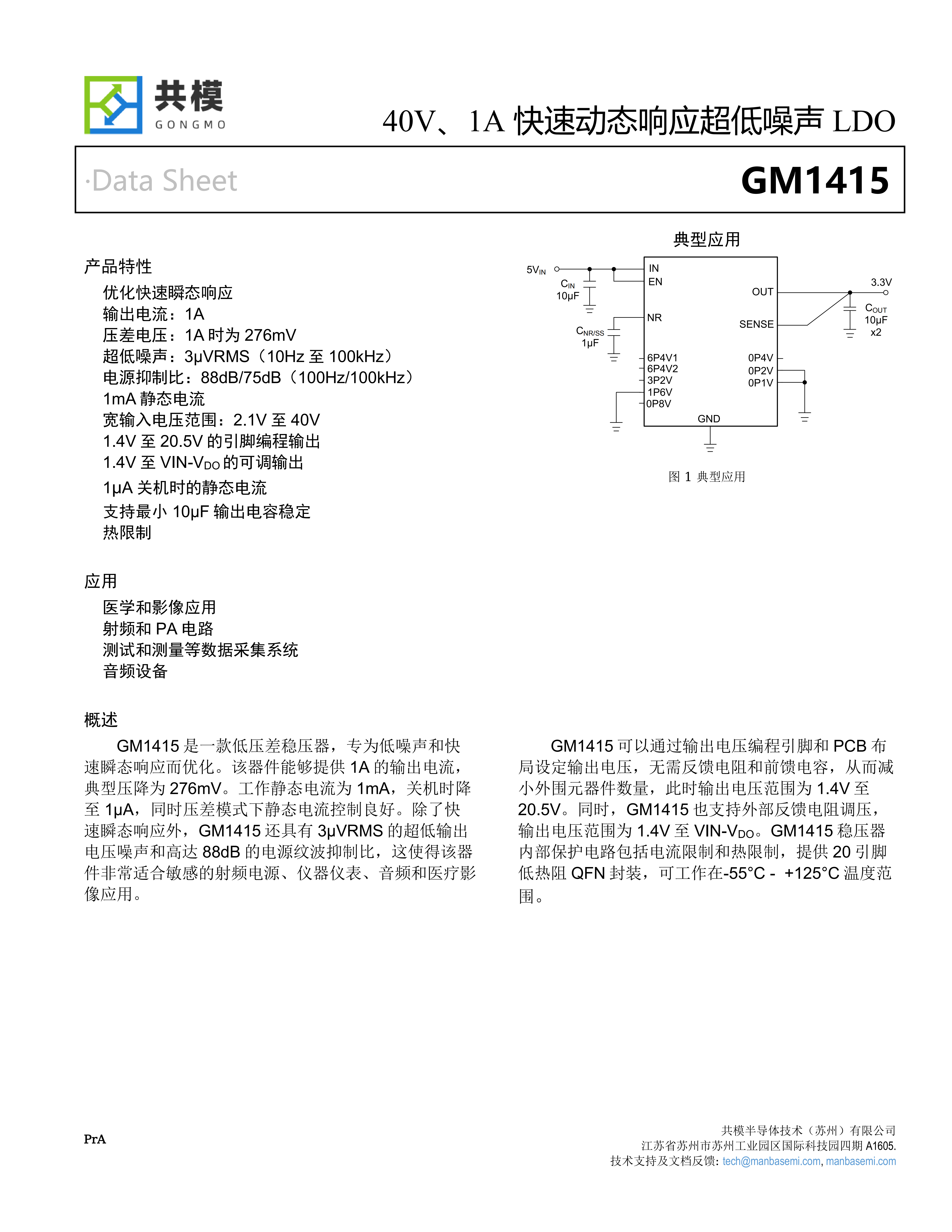 GM1415 是一款低壓差穩(wěn)壓器,專(zhuān)為低噪聲和快 速瞬態(tài)響應(yīng)而優(yōu)化