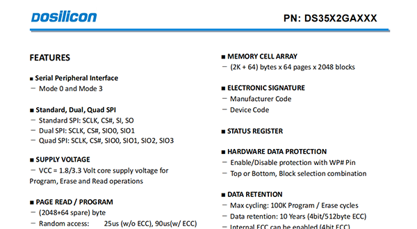 DS35X2GAXXX is a 256Mx8bit with spare 8Mx8 bit capacity.The device is offered in 3.3/1.8 Vcc Power Supply, and with SPI interface