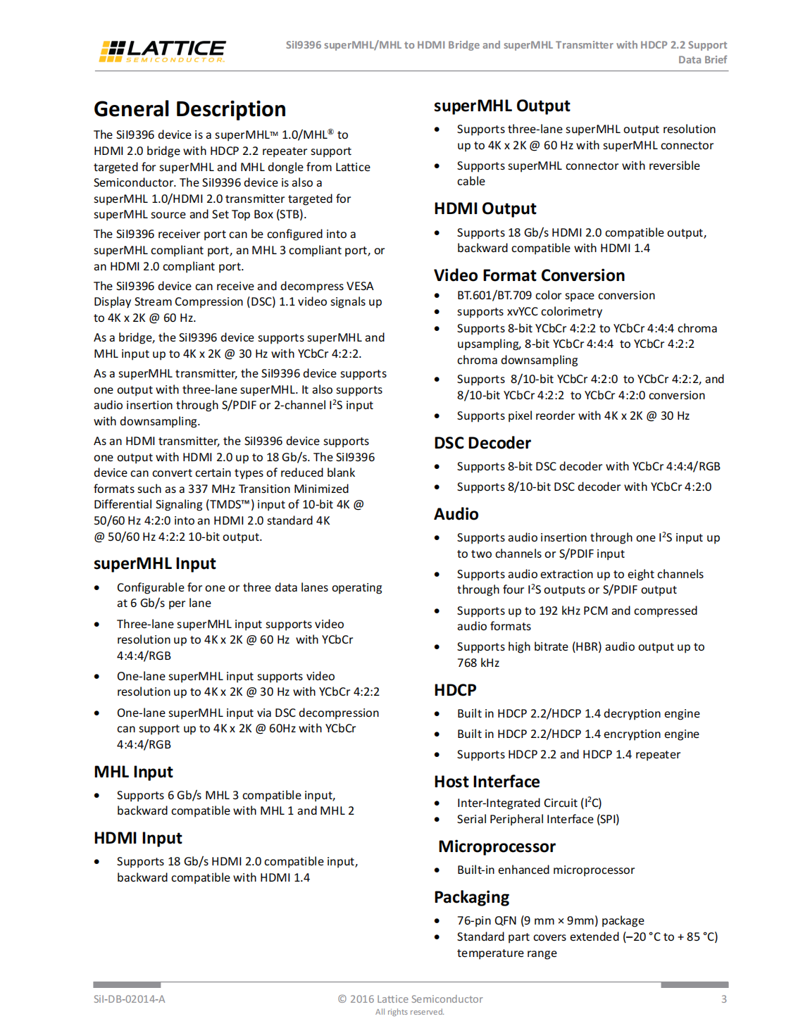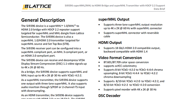 SiI9396 superMHL/MHL to HDMI Bridge and superMHL Transmitter with HDCP 2.2 Support