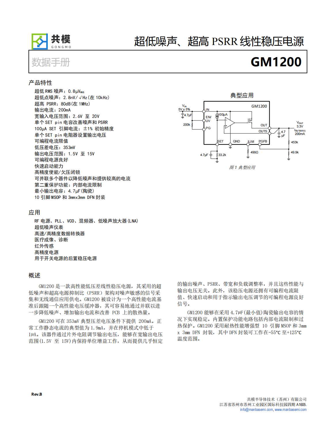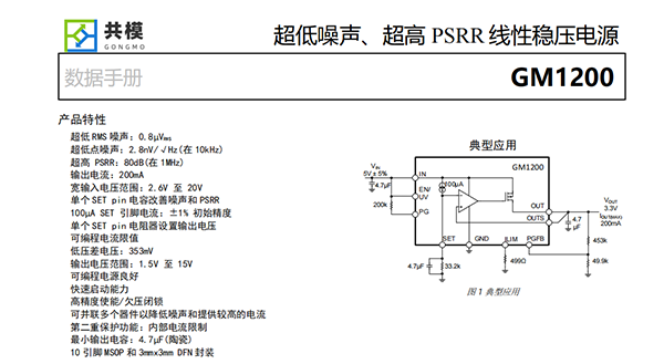 GM1200是一款高性能低壓差線性穩(wěn)壓電源,其采用的超低噪聲和超高電源抑制比(PSRR)架構(gòu)對噪聲敏感的信號采集和無線通信應用供電。GM1200被設計為一個高性能電流基準后跟隨一個高性能電壓緩沖器,其可容易地通過并聯(lián)以進一步降低噪聲、增加輸出電流和改善PCB上的散熱量。