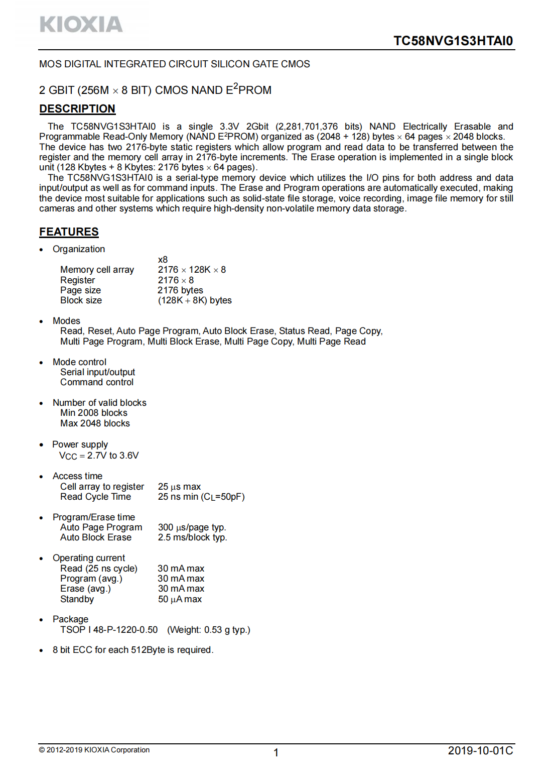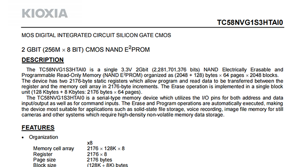 The TC58NVG1S3HTAI0 is a single 3.3V 2Gbit (2,281,701,376 bits) NAND Electrically Erasable and Programmable Read-Only Memory (NAND E2PROM) organized as (2048 + 128) bytes ? 64 pages ? 2048 blocks