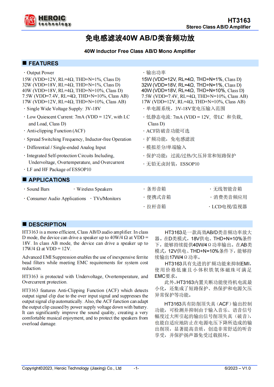 40W(VDD=18V,RL=4?,THD+N=10%,Class D)