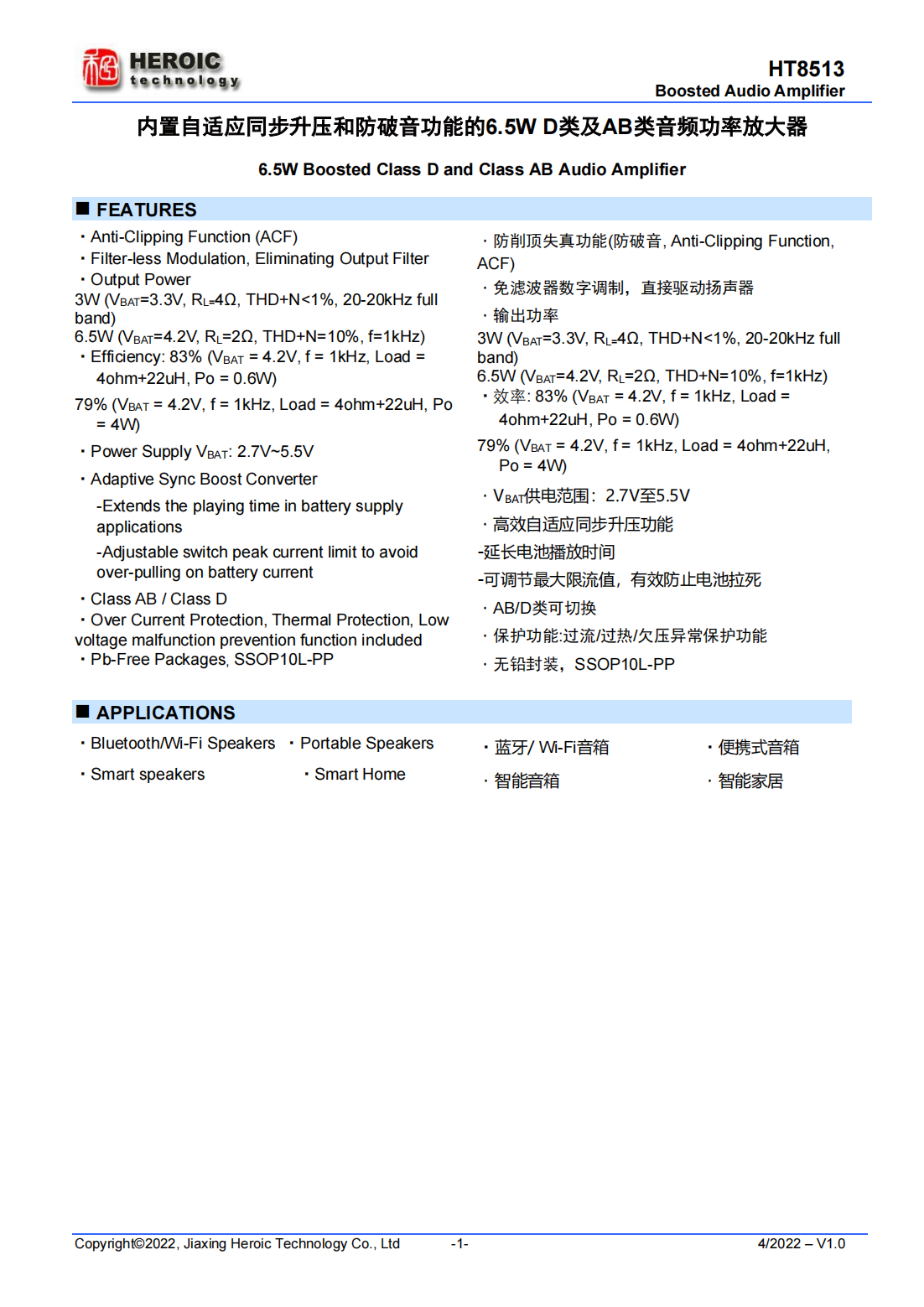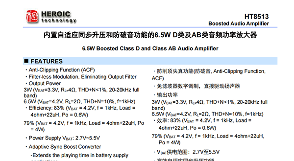 3W(VBAT=3.3V,RL=4?,THD+N<1%,20-20kHz full band)