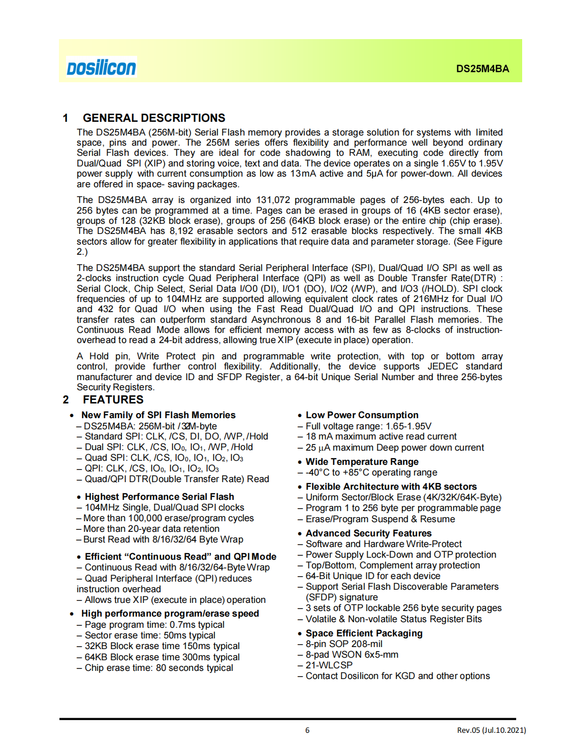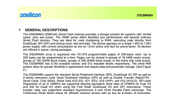 The DS25M4BA(256M-bit)Serial Flash memory provides a storage solution for systems with limited space,pins and power.The 256M series offers flexibility and performance well beyond ordinary Serial Flash devices.They are ideal for code shadowing to RAM,executing code directly from Dual/Quad SPI(XIP)and storing voice,text and data.