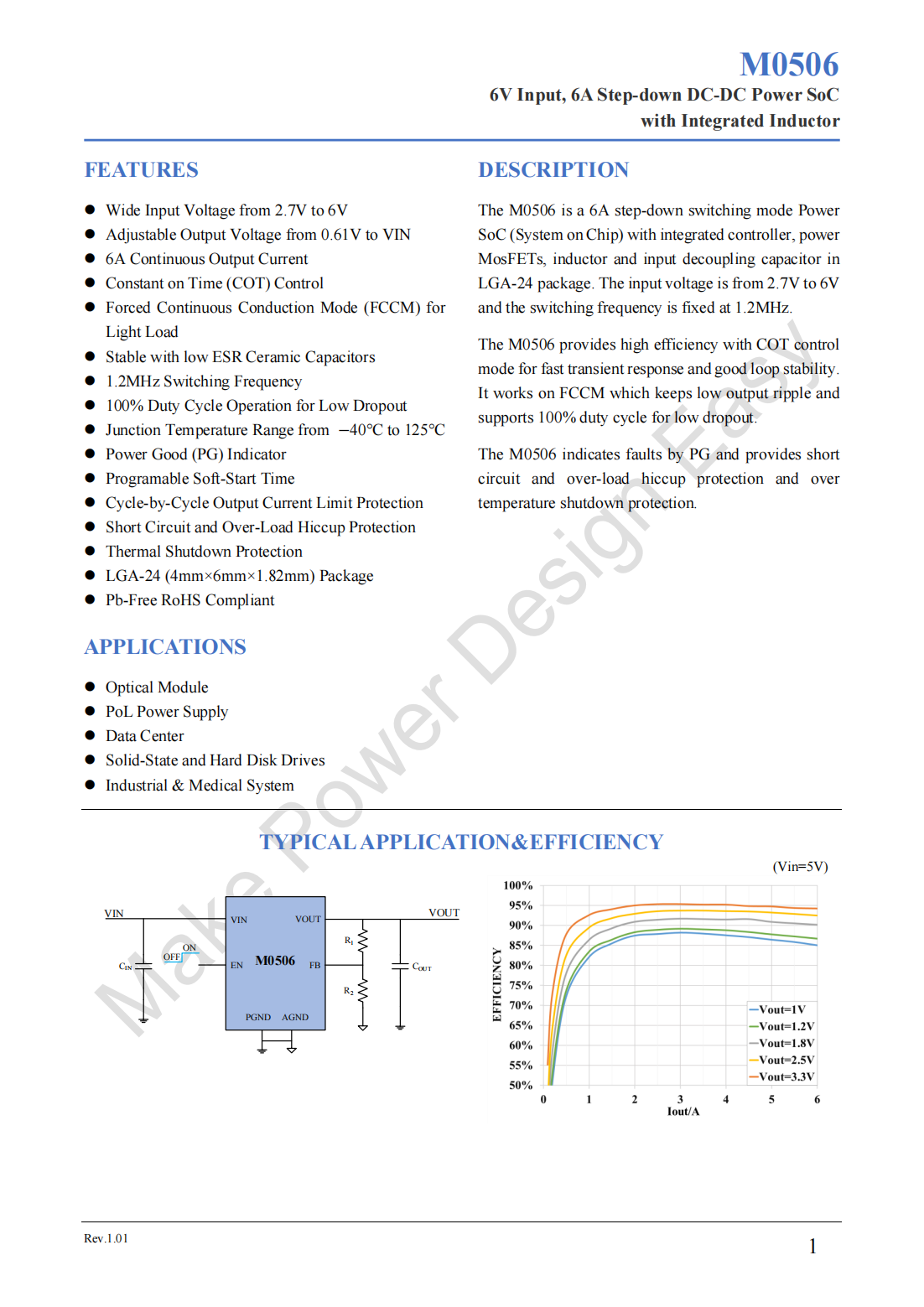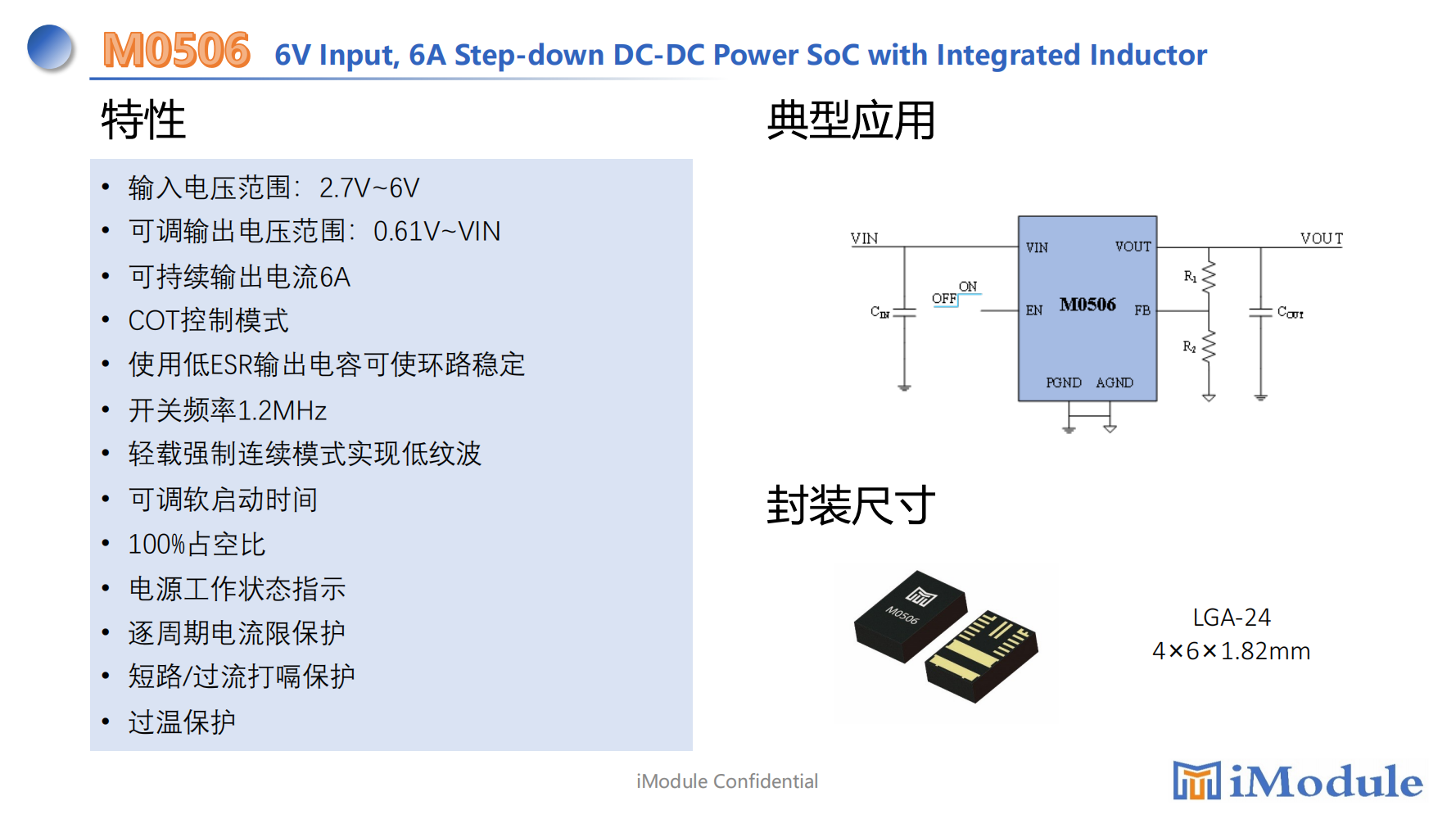 The M0506 is a 6A step-down switching mode Power SoC(System on Chip)with integrated controller,power MosFETs,inductor and input decoupling capacitor in LGA-24 package.The input voltage is from 2.7V to 6V and the switching frequency is fixed at 1.2MHz.