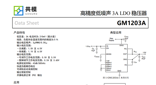 GM1203A集低噪聲、高PSRR和高輸出電流能力等特性于一體,非常適合為高速通信、視頻、醫(yī)療或測試和測量應(yīng)用等噪聲敏感型組件供電。GM1203A高性能的輸出品質(zhì),可抑制電源產(chǎn)生的相位噪聲和時鐘抖動,因此它非常適合為高性能串行器和解串器(SerDes)、模數(shù)轉(zhuǎn)換器(ADC)、數(shù)模轉(zhuǎn)換器(DAC)和射頻組件供電。該器件具備快速負(fù)載瞬態(tài)響應(yīng)的性能和大于5V的輸出能力,尤其適合射頻放大器使用。