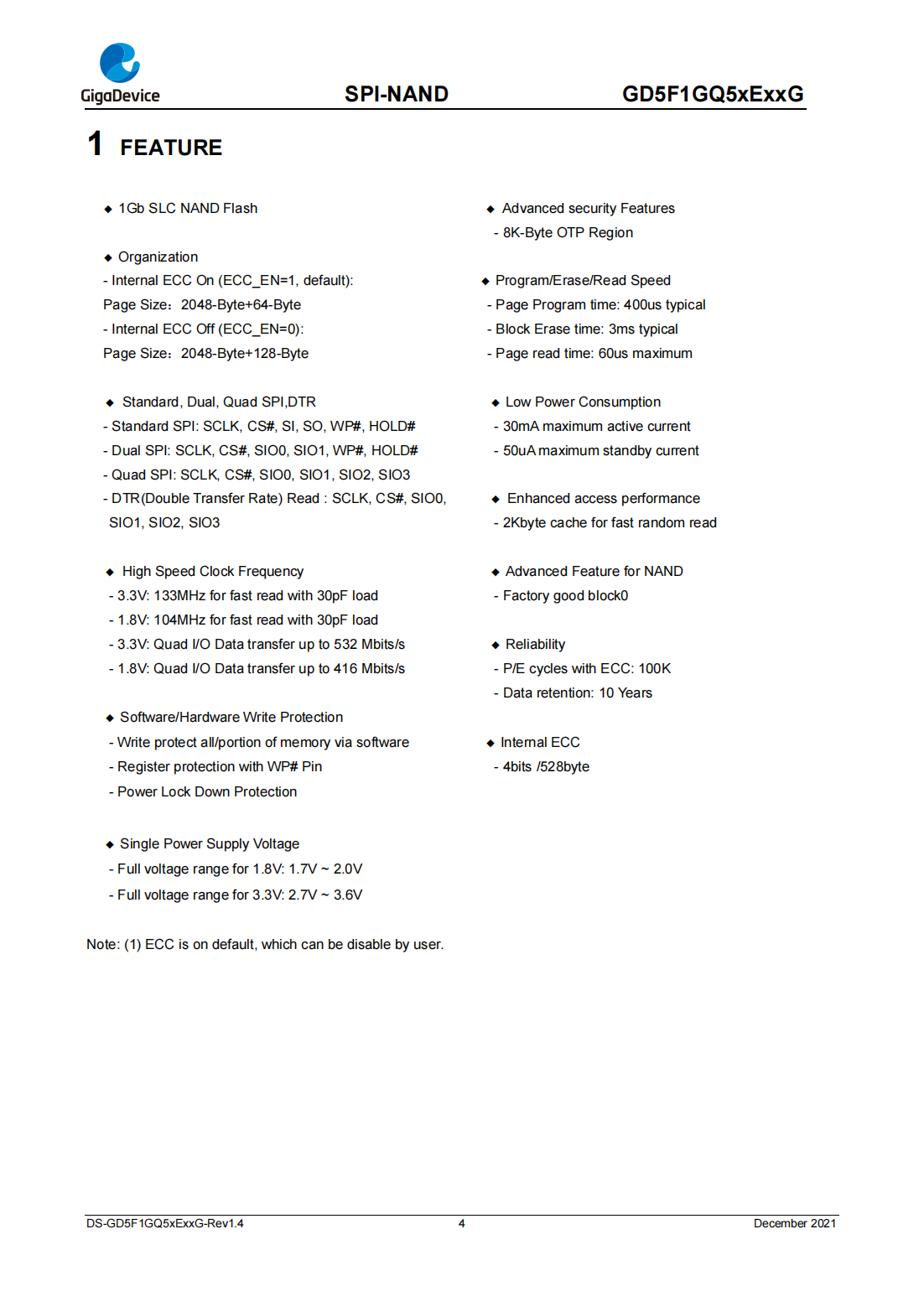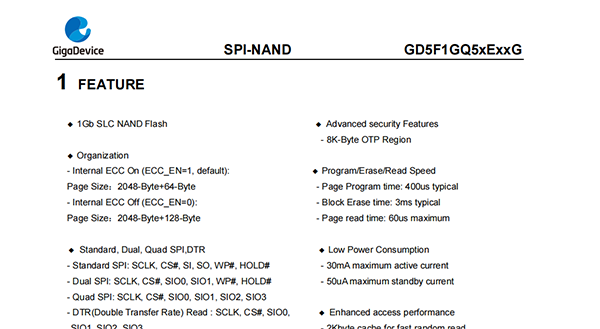-Internal ECC On(ECC_EN=1,default):◆Program/Erase/Read Speed Page Size:2048-Byte+64-Byte-Page Program time:400us typical