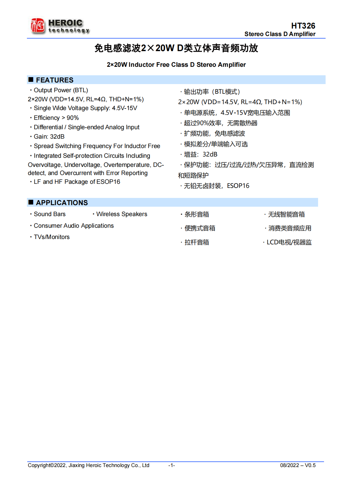 HT326是一款高效D類音頻功率放大器。在14.5V供電的、THD+N=1%條件下,能夠持續(xù)提供2*20W/4Ω功率輸出。 HT326具有先進(jìn)的擴(kuò)頻功能來抑制EMI,使用價(jià)格低廉且小體積鐵氧體磁珠可滿足EMC要求。 此外,HT326內(nèi)置關(guān)斷功能使待機(jī)電流最小化,還集成了過壓保護(hù)、直流保護(hù)、短路保護(hù)、熱保護(hù)和電源欠壓異常保護(hù)等功能,可全面防止出現(xiàn)故障。