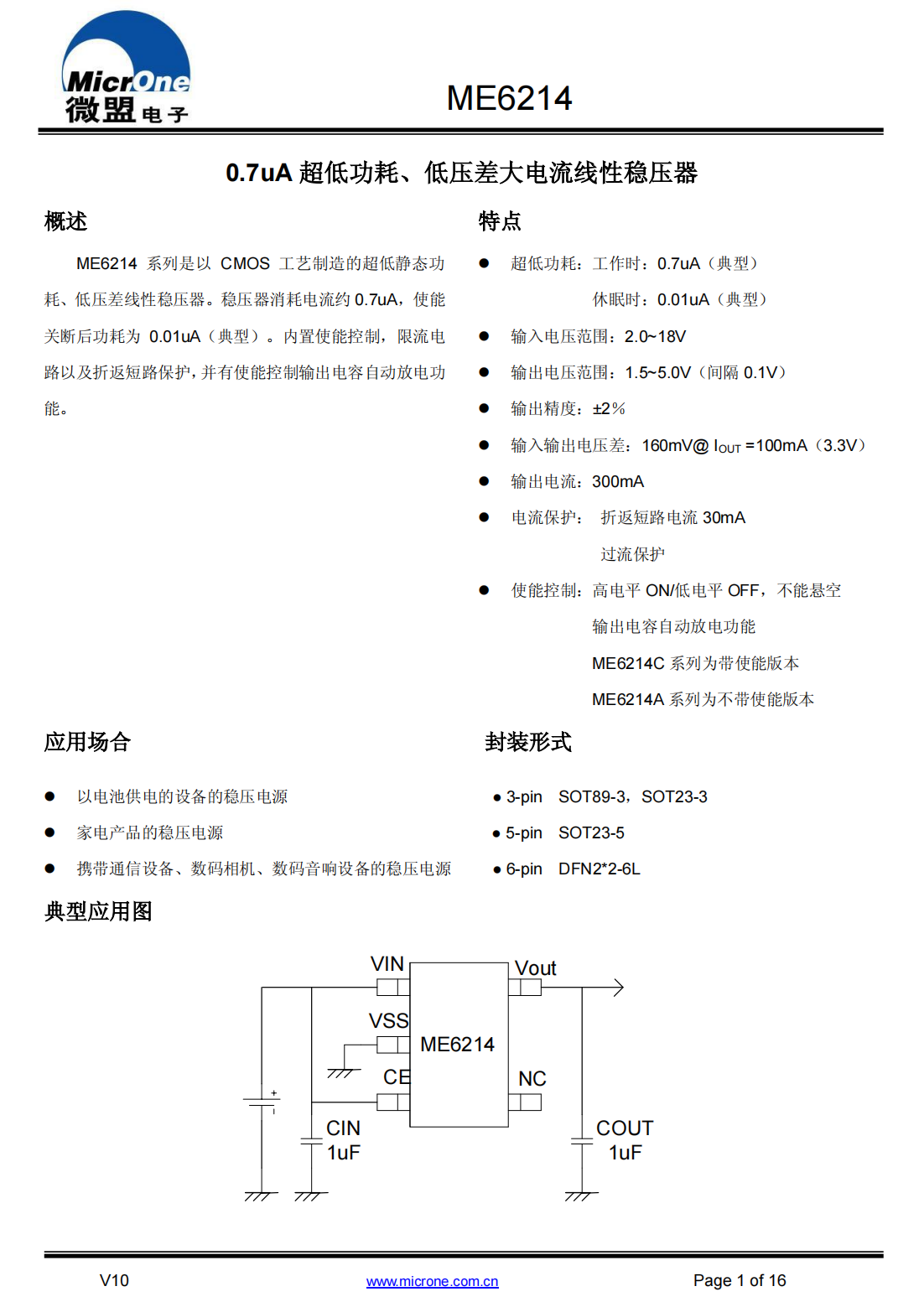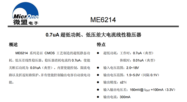 ME6214系列是以CMOS工藝制造的超低靜態(tài)功耗、低壓差線性穩(wěn)壓器。穩(wěn)壓器消耗電流約0.7uA,使能關(guān)斷后功耗為0.01uA(典型)。內(nèi)置使能控制,限流電路以及折返短路保護(hù),并有使能控制輸出電容自動(dòng)放電功能。