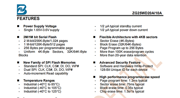 The ZG25WD20A/10A of non-volatile flash memory device supports the standard Serial PeripheralInterface (SPI). Traditional SPI single bit serial input and output (Single I/O or SIO) is supported as well asoptional two bit (Dual I/O or DIO) serial protocols. This multiple width interface is called SPI Multi-I/O or MIO.