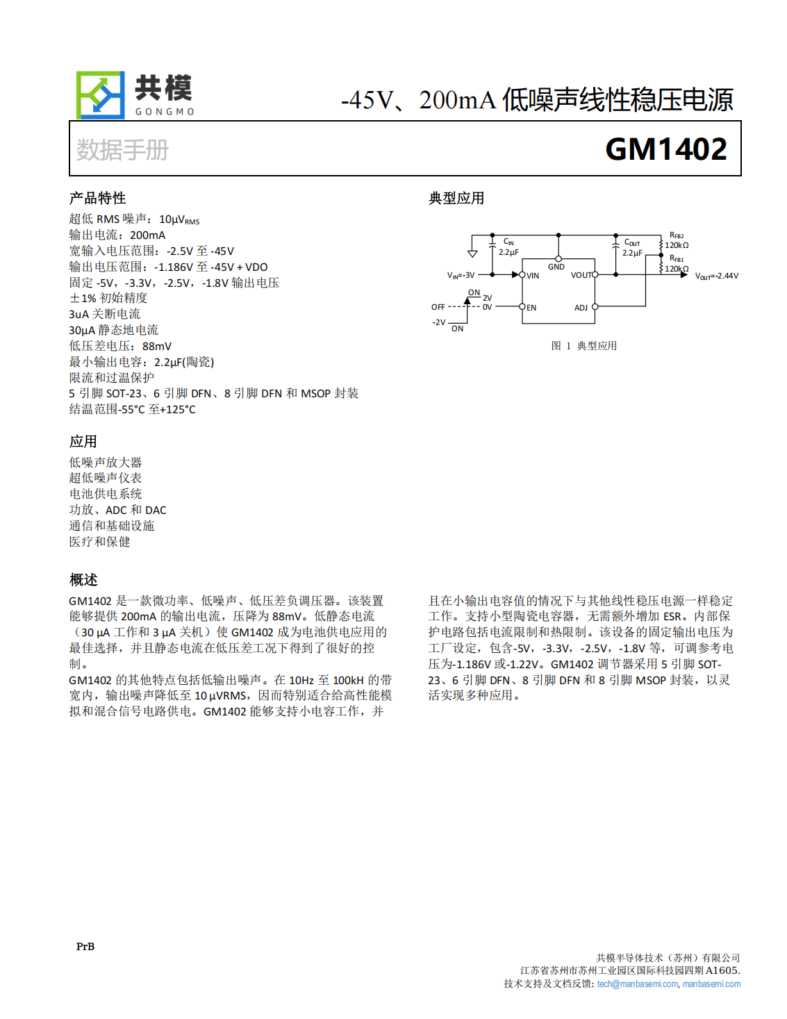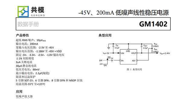 GM1402是一款微功率、低噪聲、低壓差負(fù)調(diào)壓器。該裝置能夠提供200mA的輸出電流,壓降為88mV。低靜態(tài)電流(30μA工作和3μA關(guān)機(jī))使GM1402成為電池供電應(yīng)用的最佳選擇,并且靜態(tài)電流在低壓差工況下得到了很好的控制。