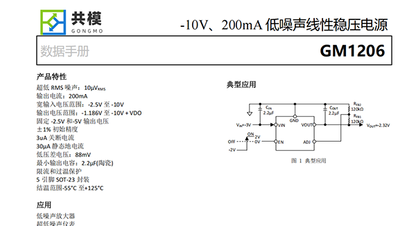 GM1206的其他特點包括低輸出噪聲。在10Hz至100kH的帶寬內(nèi),輸出噪聲降低至10μVRMS,因而特別適合給高性能模擬和混合信號電路供電。GM1206能夠支持小電容工作,并且在小輸出電容值的情況下與其他線性穩(wěn)壓電源一樣穩(wěn)定工作。支持小型陶瓷電容器,無需額外增加ESR。內(nèi)部保護電路包括電流限制和熱限制。該設(shè)備的固定輸出電壓為-2.5V和-5V,可調(diào)參考電壓為-1.186V。GM1206調(diào)節(jié)器采用5引腳SOT-23封裝,以靈活實現(xiàn)多種應(yīng)用。