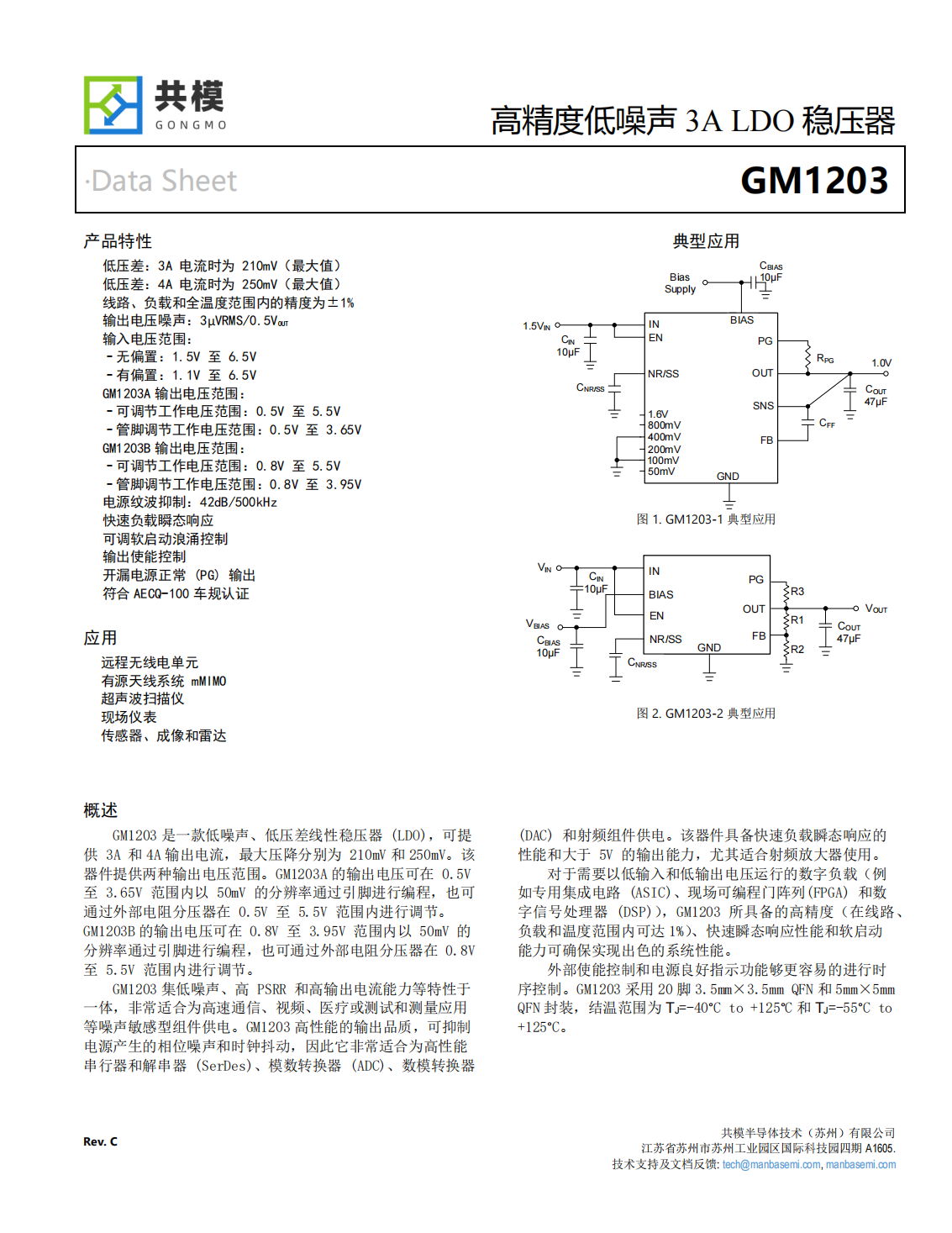 GM1203集低噪聲、高PSRR和高輸出電流能力等特性于一體,非常適合為高速通信、視頻、醫(yī)療或測(cè)試和測(cè)量應(yīng)用等噪聲敏感型組件供電。GM1203高性能的輸出品質(zhì),可抑電源產(chǎn)生的相位噪聲和時(shí)鐘抖動(dòng),因此它非常適合為高性能串行器和解串器(SerDes)、模數(shù)轉(zhuǎn)換器(ADC)、數(shù)模轉(zhuǎn)換器(DAC)和射頻組件供電。該器件具備快速負(fù)載瞬態(tài)響應(yīng)的性能和大于5V的輸出能力,尤其適合射頻放大器使用。對(duì)于需要以低輸入和低輸出電壓運(yùn)行的數(shù)字負(fù)載(例如專用集成電路(ASIC)、現(xiàn)場(chǎng)可編程門(mén)陣列(FPGA)和數(shù)字信號(hào)處理器(DSP)),GM1203所具備的高精度(在線路、負(fù)載和溫度范圍內(nèi)可達(dá)1%)、快速瞬態(tài)響應(yīng)性能和軟啟動(dòng)能力可確保實(shí)現(xiàn)出色的系統(tǒng)性能。外部使能控制和電源良好指示功能夠更容易的進(jìn)行時(shí)序控制。GM1203采用20腳3.5mm×3.5mm QFN和5mm×5mm QFN封裝,結(jié)溫范圍為T(mén)J=-40°C to+125°C和TJ=-55°C to+125°C。