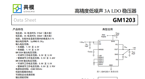 GM1203是一款低噪聲、低壓差線性穩(wěn)壓器(LDO),可提供3A和4A輸出電流,最大壓降分別為210mV和250mV。該器件提供兩種輸出電壓范圍。GM1203A的輸出電壓可在0.5V至3.65V范圍內(nèi)以50mV的分辨率通過(guò)引腳進(jìn)行編程,也可通過(guò)外部電阻分壓器在0.5V至5.5V范圍內(nèi)進(jìn)行調(diào)節(jié)。