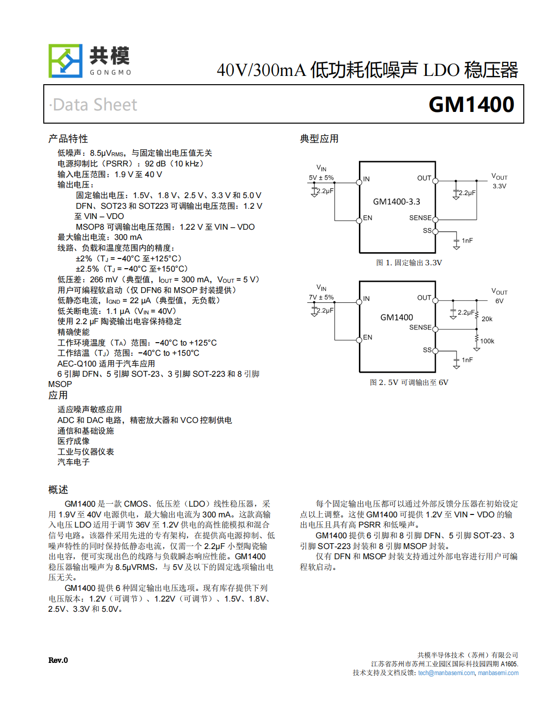 GM1400提供6種固定輸出電壓選項(xiàng)。現(xiàn)有庫(kù)存提供下列電壓版本:1.2V(可調(diào)節(jié))、1.22V(可調(diào)節(jié))、1.5V、1.8V、2.5V、3.3V和5.0V。每個(gè)固定輸出電壓都可以通過(guò)外部反饋分壓器在初始設(shè)定點(diǎn)以上調(diào)整。這使GM1400可提供1.2V至VIN?VDO的輸出電壓且具有高PSRR和低噪聲。