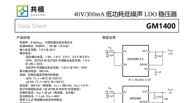 GM1400是一款CMOS、低壓差(LDO)線性穩(wěn)壓器,采用1.9V至40V電源供電,最大輸出電流為300 mA。這款高輸入電壓LDO適用于調(diào)節(jié)36V至1.2V供電的高性能模擬和混合信號(hào)電路。該器件采用先進(jìn)的專有架構(gòu),在提供高電源抑制、低噪聲特性的同時(shí)保持低靜態(tài)電流,僅需一個(gè)2.2μF小型陶瓷輸出電容,便可實(shí)現(xiàn)出色的線路與負(fù)載瞬態(tài)響應(yīng)性能。GM1400穩(wěn)壓器輸出噪聲為8.5μVRMS,與5V及以下的固定選項(xiàng)輸出電壓無(wú)關(guān)。