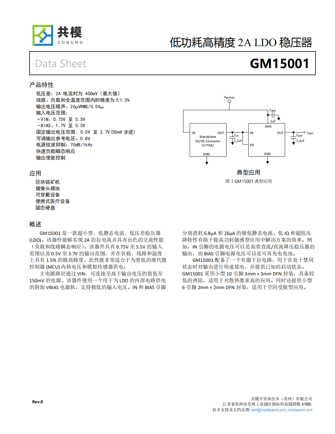 GM15001是一款超小型、低靜態(tài)電流、低壓差穩(wěn)壓器(LDO)。該器件能夠?qū)崿F(xiàn)2A的拉電流并具有出色的交流性能(負(fù)載和線路瞬態(tài)響應(yīng))。該器件具有0.75V至5.5V的輸入范圍以及0.5V至3.7V的輸出范圍,并在負(fù)載、線路和溫度上具有1.5%的極高精度。此性能非常適合于為更低的現(xiàn)代微控制器(MCU)內(nèi)核電壓和模擬傳感器供電。主電源路徑通過VIN,可連接至高于輸出電壓的值低至150mV的電源。該器件使用一個(gè)用于為L(zhǎng)DO的內(nèi)部電路供電的附加VBIAS電源軌,支持極低的輸入電壓。IN和BIAS引腳分別消耗6.8μA和26μA的極低靜態(tài)電流。低IQ和超低壓降特性有助于提高功耗敏感型應(yīng)用中解決方案的效率。例如,IN引腳的電源電壓可以是高效直流/直流降壓穩(wěn)壓器的輸出,而BIAS引腳電源電壓可以是可再充電電池。