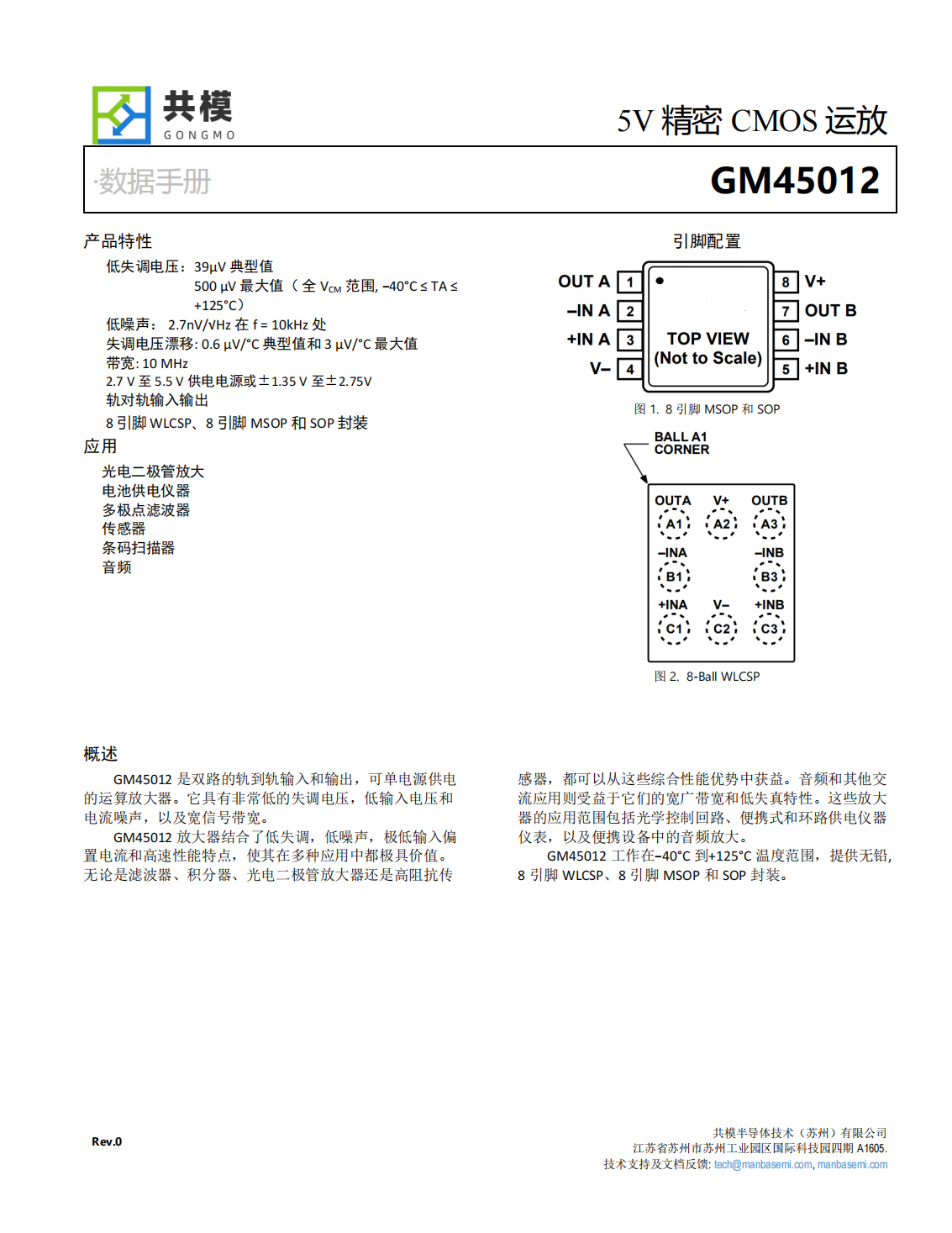 GM45012工作在?40°C到+125°C溫度范圍,提供無鉛,8引腳WLCSP、8引腳MSOP和SOP封裝。