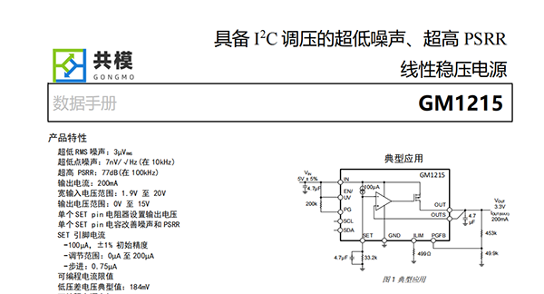 GM1215可在233mV典型壓差電壓條件下提供200mA。正常工作靜態(tài)電流的典型值為0.5mA,并在停機模式中低于1μA。該器件通過片外電阻調(diào)節(jié)輸出電壓,能夠在寬輸出電壓范圍(0V至15V)內(nèi)保持單位增益工作,從而提供幾乎恒定的輸出噪聲、PSRR、帶寬和負載調(diào)整率,并且這些性能與輸出電壓無關(guān)。GM1215可通過I2C通信接口調(diào)節(jié)SET引腳電流以實現(xiàn)在線調(diào)節(jié)輸出電壓。此外,該穩(wěn)壓電源還擁有可編程電流限值、快速啟動和用于指示輸出電壓調(diào)節(jié)的可編程電源良好信號。